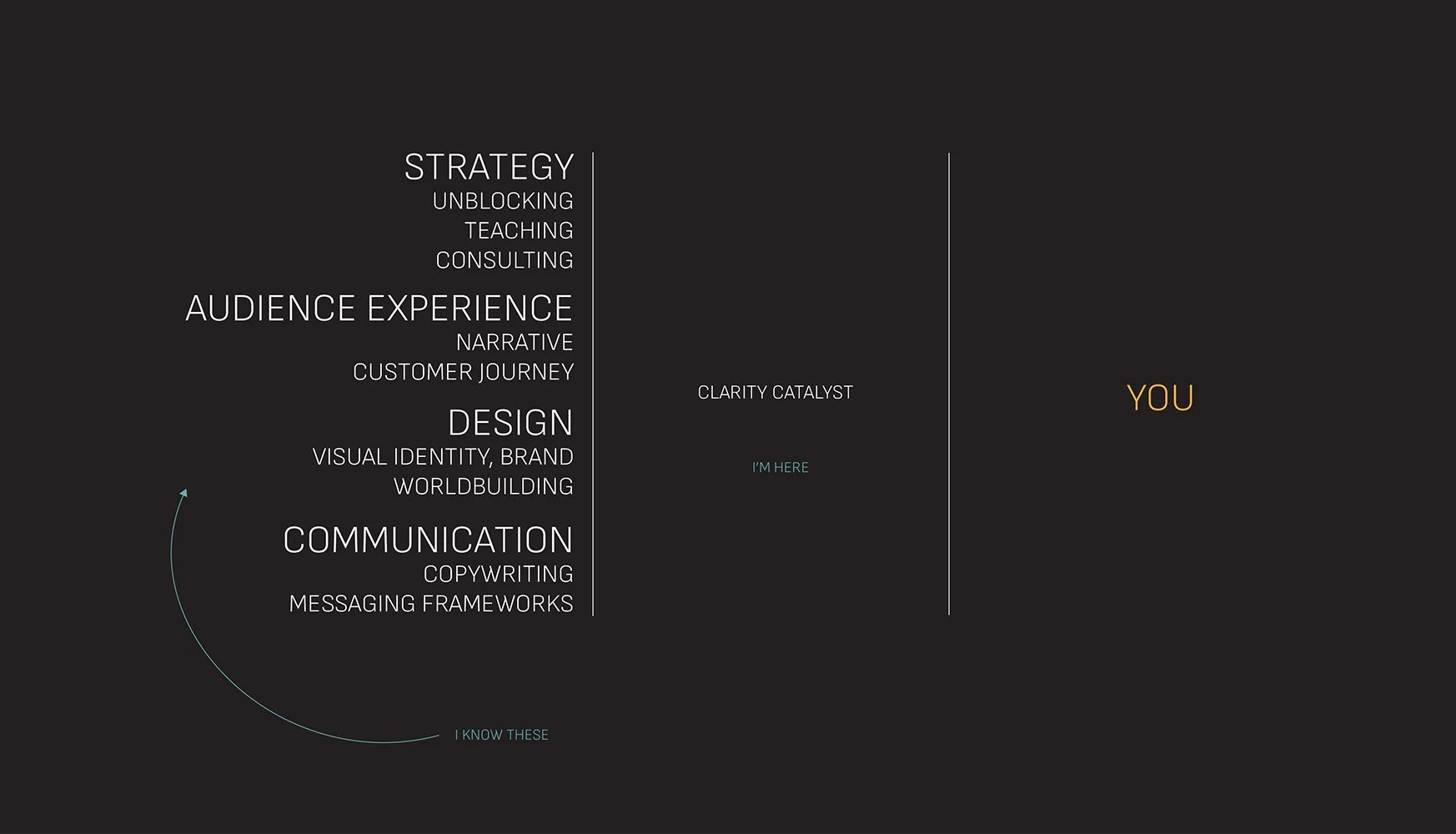 That means I consult idea people and help them build. I create frameworks and teach creatives.
